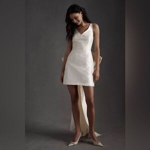 The Sachin & Babi Archie Mini Dress has a show-stopping detail: a whimsical, oversized bow with trailing streamers. (P.S. You can remove the bow for an effortless second look!) This elegantly tailored dupioni mini is finished with a sleek v-neckline and a slight fit and flare skirt - perfect for elopements, courthouse weddings, and pre-big day bridal events!