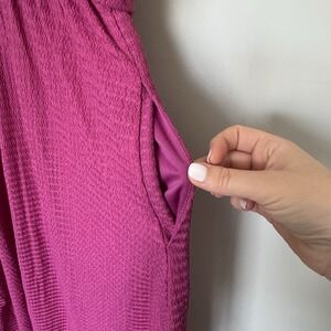 Keywords: midi dress, flutter sleeve, v-neck dress, elastic waist, tie back, casual dress, summer dress, boho dress, pockets, purple dress, knee length dress, comfortable dress