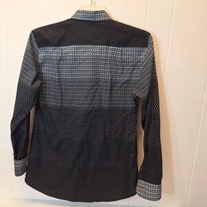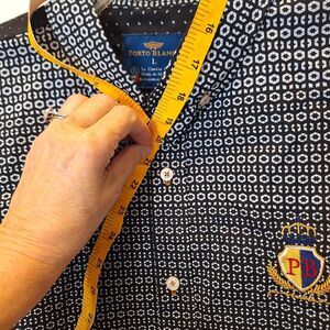 Porto Blanco Black Pattern Button Flip Cuff 100% Algondon Cotton Shirt Men's Large. Garment is in good, preowned condition. This item may have been previously worn. All buttons, snaps and zippers operate as designed. Please see photos for measurements and item condition.