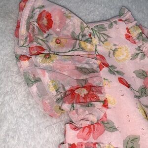 Charming floral dress in pink, perfect for any occasion. Features ruffle flutter sleeves and one button & one snap in back. Lined. So pretty! 🌸🌺