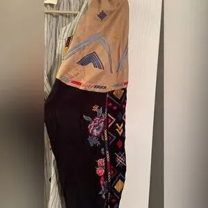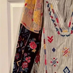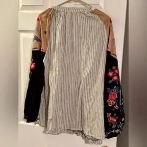 Vibrant embroidery on striped fabric. Long sleeves with floral patterns. Unique geometric accents. Size 1X, measurements bust 52”, shoulder to hem 28”, length from neck 27”