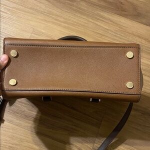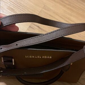 Small/medium sized purse. Used a few times only. No Stains inside that I can see, no peeling anywhere on purse or straps. Comes with strap. See pics! Chic Michael Kors satchel with a stylish two-tone design. Perfect for versatile wear. Features sturdy handles and sleek silhouette.