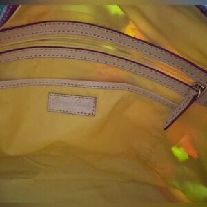 Great condition! This is a PVC tote with some dimpling due to age, but keeping the bag stuffed helps! Some patina on the natural leather piping - not uncommon with Dooney & Bourke bags! Please ask any questions!