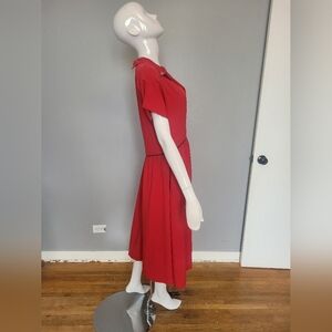 Bettie Page 'Marie' Dress in red with black piping trim. Flare skirt with fitted top. Retro over-sized cap sleeves. Vintage style decorative front button embellishments which is echoed on the collar points. Black piping at the waist. Zip fasten on back. Lined.