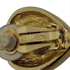 These vintage Givenchy earrings are circa. 1980s and feature striking heart-shaped clear glass crystals set within elegant gold-tone bezels, making them a captivating accessory. The design combines classic charm with a touch of sparkle, ideal for adding a sophisticated accent to any outfit or occasion. Crafted with attention to detail, these earrings offer a blend of quality and timeless style. Earrings measure 3/4 inch tall and 3/4 inch wide with clip on backs. Earrings are stamped Givenchy on two places on backside. Excellent condition