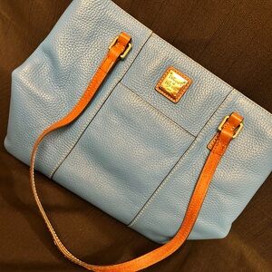 Chic and versatile tote by Dooney & Bourke. Features a sky blue leather body with contrasting tan straps. Perfect for daily essentials.