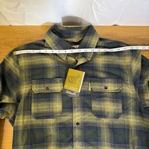 Biltwell Hi-Test Moss Flannel Shirt, Size Medium. This rugged flannel shirt features a classic moss green and black plaid pattern. Made from durable heavyweight cotton, it's perfect for cooler weather or as a layering piece. It includes two chest pockets with button closures and a full button-down front. Excellent new with tags condition. Men’s size Medium.