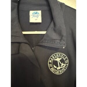 Coastal charm meets casual comfort in this navy pullover jacket. A circular emblem featuring an anchor and 'Marshfield Massachusetts' adds a nautical touch, while the quarter-zip neckline and snap-button details offer a blend of style and practicality. The front pouch pocket, complete with snap closures, provides secure storage, and the drawstring hem allows for an adjustable fit. Perfect for a breezy beach walk, a casual weekend outing, or a cozy evening by the fire.