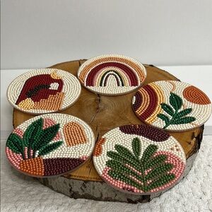 Set of five beaded coasters with vibrant designs. Features green, pink, brown, and cream colors. Perfect for adding a pop of color to your table.