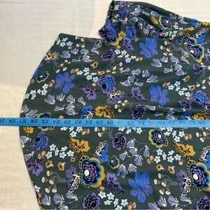 Chic blouse featuring a lively floral design. Accents of purple, yellow, and blue on a green base.