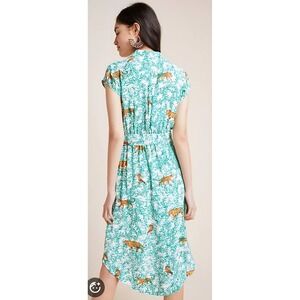 Maeve by Anthropologie button-front midi dress in a rare safari/jungle print featuring tigers, leopards, and tropical birds layered over green botanical vines. Fully lined and made from 100% viscose — lightweight, drapey, and breathable.