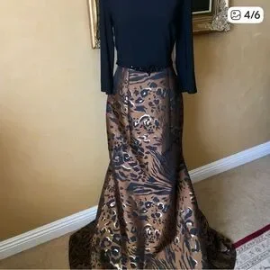 A stunning gown with a black knit top for the bodice with long sleeves, an Embellished matching belt and the most incredible animal print trumpet skirt! The scuba fabric is heavy and sumptuous, lined and has tulle added for fullness. Flat approximate measurements unstretched and stretched; 17"-21"/16"/21.5", length 62".
