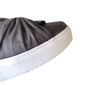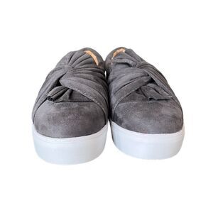 Gray suede CATHERINE MALANDRINO platform slip on sneakers! Entirely made of man-made material. Faux knot on the front in medium gray faux suede. Elastic around tongue for easy slide on/off. White 1.5” platform. Only worn a couple times, excellent preowned condition! Some of the glue around edges is discolored and has a pink tint (example in photos). A couple of marks on the white platform section. Size 8. Still has the size sticker on. Some cushioning in the sole.