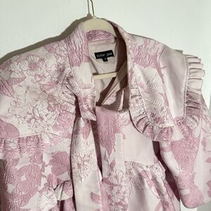 Color & Detail: Floral jacquard with statement bow detail, ruffles at shoulders and waist, feminine silhouette