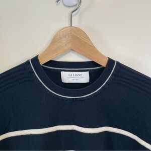 La Ligne Striped Light Crew Neck Cotton Long Sleeve Sweater in Navy and White