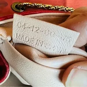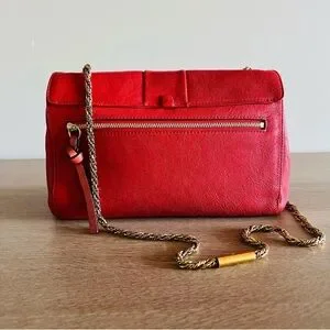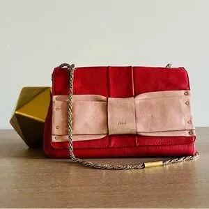 Chloe June Bow Shoulder Bag in Holly Berry Red Sheepskin Leather. Comes with dust bag, original tags, authenticity card, and certificate of authenticity. Brass-tone rope chain, bow-detailed flap with magnetic closure, clean lambskin interior with a slip pocket, and rear zip pocket. Corners look great, but there is a very slight dinginess to the pink leather bow. Pressure marks and discoloration under the flap from the chain. One teeny tiny interior blip by the slip pocket.