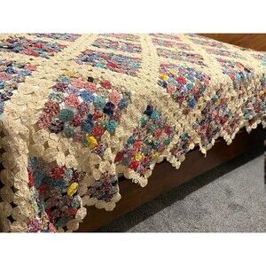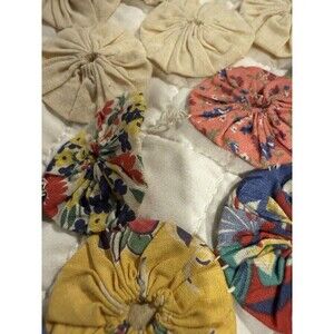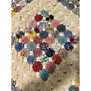 This antique yo yo quilt features a large queen/small king size of 92 x 96 with a unique diamond pattern and scalloped edges. Made from cotton, this handmade quilt is perfect for all seasons and any room in the house. Its vintage style adds a touch of nostalgia to any bedroom or living space. With a multicolor design and intricate yo yo details, this one-piece quilt is a timeless collectible that requires hand wash care.