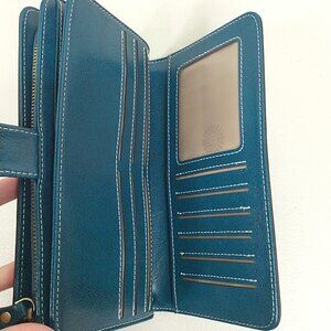 Women's Leather Organizer Wallet with RFID Blocking and wristlet strap.