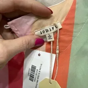 Vibrant dress with pink, orange, and cream stripes. Perfect for a casual day out. It fits me with a larger bust as I’m a 38 D and this is a large size dress. Good length as you can tell in the pictures as I’m 5’9”.