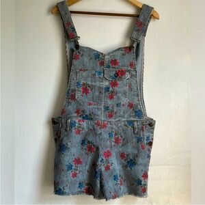 Stylish denim overalls with floral print. Perfect for casual outings. Features adjustable straps and front pockets.