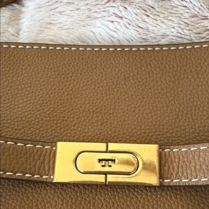Elegant Tory Burch shoulder bag. Features tan leather with gold accents. Stylish and versatile.
