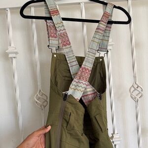 Burton snow bib in forest green. Features unique patterned straps and a front pocket.