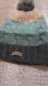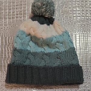 Stylish and cozy cable knit beanie. Features a blend of teal and gray. Perfect for cold weather.