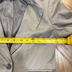 Elegant gray blazer with a single-button front. Perfect for professional and casual settings.