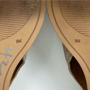 Lucky Brand tan Saimy leather open toe block heel back zip shoes, 9M. Great condition with minor wear/dirt to the soles.