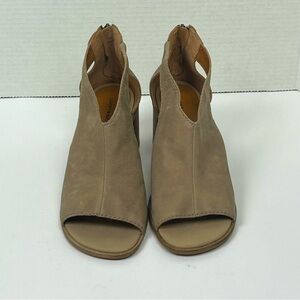 Lucky Brand tan Saimy leather open toe block heel back zip shoes, 9M.