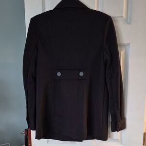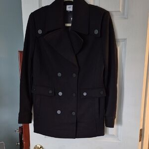 new with tags . Chic black trench coat by CAbi. Double-breasted design. Ideal for versatile styling. 20 in armpit to armpit 30 in shoulder seam to hemline. Fabulous Ponte Knit. front working pockets with matte black detail button. gorgeous singing in back for a flattering fit.