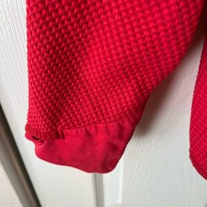 Lightweight long sleeve zip up jacket with pockets. Please note this is not hooded. I wore this a lot for exercising outside in the winter, so there are signs of wear, but it’s still an excellent jacket that’s got plenty of wear left. See pictures for some light piling /pulled thread. Women’s size large