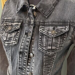 Stylish charcoal denim jacket. Features button front and chest pockets. Ideal for layering.