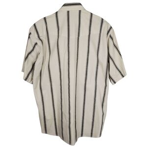 This vintage Wrangler shirt features a cream base with bold black stripes, perfect for a casual yet polished look. Made from lightweight fabric, it is ideal for warm weather and versatile enough for various occasions. Its classic collar and simple design make it a must-have in any wardrobe.