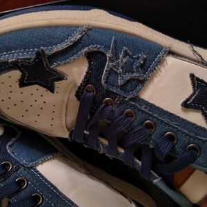 Step up your style with these PACOGIL sneakers, a perfect blend of denim and white leather with bold star accents for a standout, retro-inspired look. These low-top sneakers are designed for streetwear, casual wear, and everyday comfort, featuring a durable rubber sole for traction and long-lasting wear, plus a cushioned insole for all-day support. The lace-up design ensures a secure, adjustable fit, making them ideal for men or women who love urban fashion, trendy footwear, and statement sneakers. Pair them with jeans, shorts, or casual pants for an effortless, stylish outfit. These size 42 (EU) sneakers are gently worn and show minor scuff marks on the leather and sole, which is reflected in the price. Perfect for sneaker enthusiasts, fashion-forward individuals, and those who appreciate unique shoes with character. Don’t miss your chance to own these eye-catching, versatile sneakers that combine comfort, quality, and style