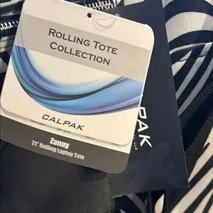 Stylish zebra print rolling tote by Calpak. Features black and white design with convenient handles and wheels.