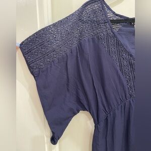 Elegant navy dress with intricate lace details. Long sleeves and relaxed fit. Perfect for any occasion.