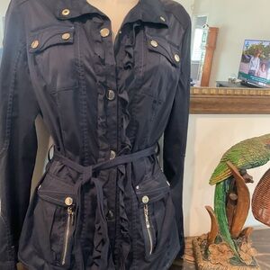 White House Black Market Navy Trench Coat with Ruffles