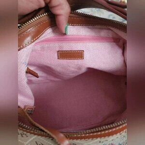 Dooney Bourke Designer Women's Brown Signature Canvas Bucket Handbag Purse. Leather and Fabric with/ bag charm and inside pockets. Authentic Dooney Bourke.