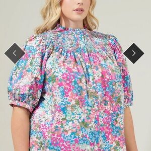 SUGARLIPS Avery Blossom Floral Smocked Mock Neck Top with Button up front.