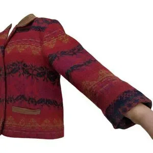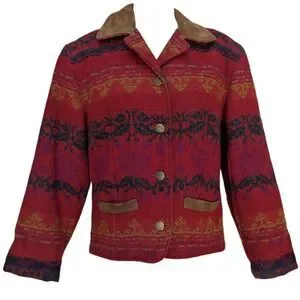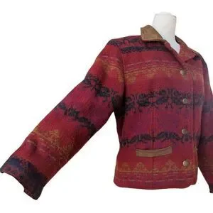 Vintage Woolrich Jacket Red Southwestern Aztec Suede Leather Trim USA Button Up Closure