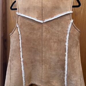 Elevate your wardrobe with this chic tan shearling vest. Featuring a cozy cream lining, it's perfect for layering and adding a touch of elegance to any outfit. Two small pinpoint black dots. Shown in picture.