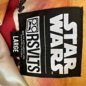 Vibrant button-up shirt with playful cartoon characters. Features a mix of colors for a fun look. Bluey and Star Wars. Sold as a bundle. $20 for both. Like new. No rips or stains.