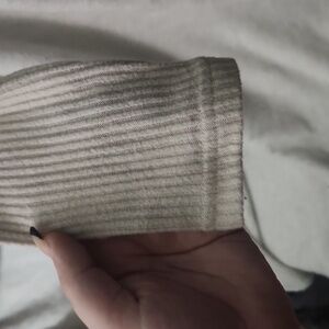 Elevate your wardrobe with this stylish beige ribbed top. Perfect for any occasion, this top offers both comfort and elegance. size s. 18" pit to pit. 18" sleeve