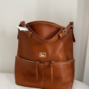 Chic and versatile brown leather large shoulder bag. Features Dooney & Bourke metal logo. Perfect for everyday use.