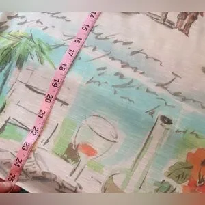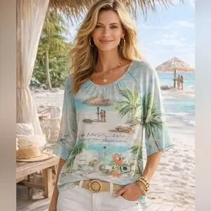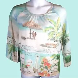 Escape to island vibes đ´ with this beautiful Chicoâs tropical print top featuring a hand-painted style beach scene with palm trees, seaside umbrellas, wine glasses, and resort details. Soft pastel blues and greens give it an effortless vacation feelâperfect for cruises, beach dinners, or casual summer days.