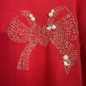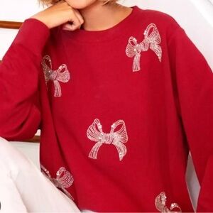 Chic red sweater adorned with elegant bow designs. Perfect for adding a stylish touch to any outfit.