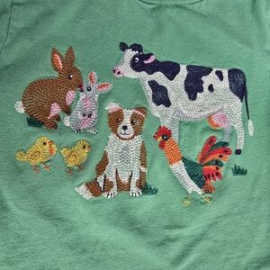 Mini Boden 2-3 toddler. Green top featuring farm animals embroidered on. Great top for Spring and Easter. inside tag is cut