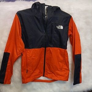 Stylish raincoat by The North Face. Features a bold black and orange design. Lightweight and durable.