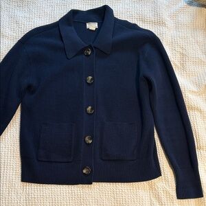 Stylish dark blue cardigan with button front. Features two front pockets. Ideal for layering. Oversized Small. See photos for measurements